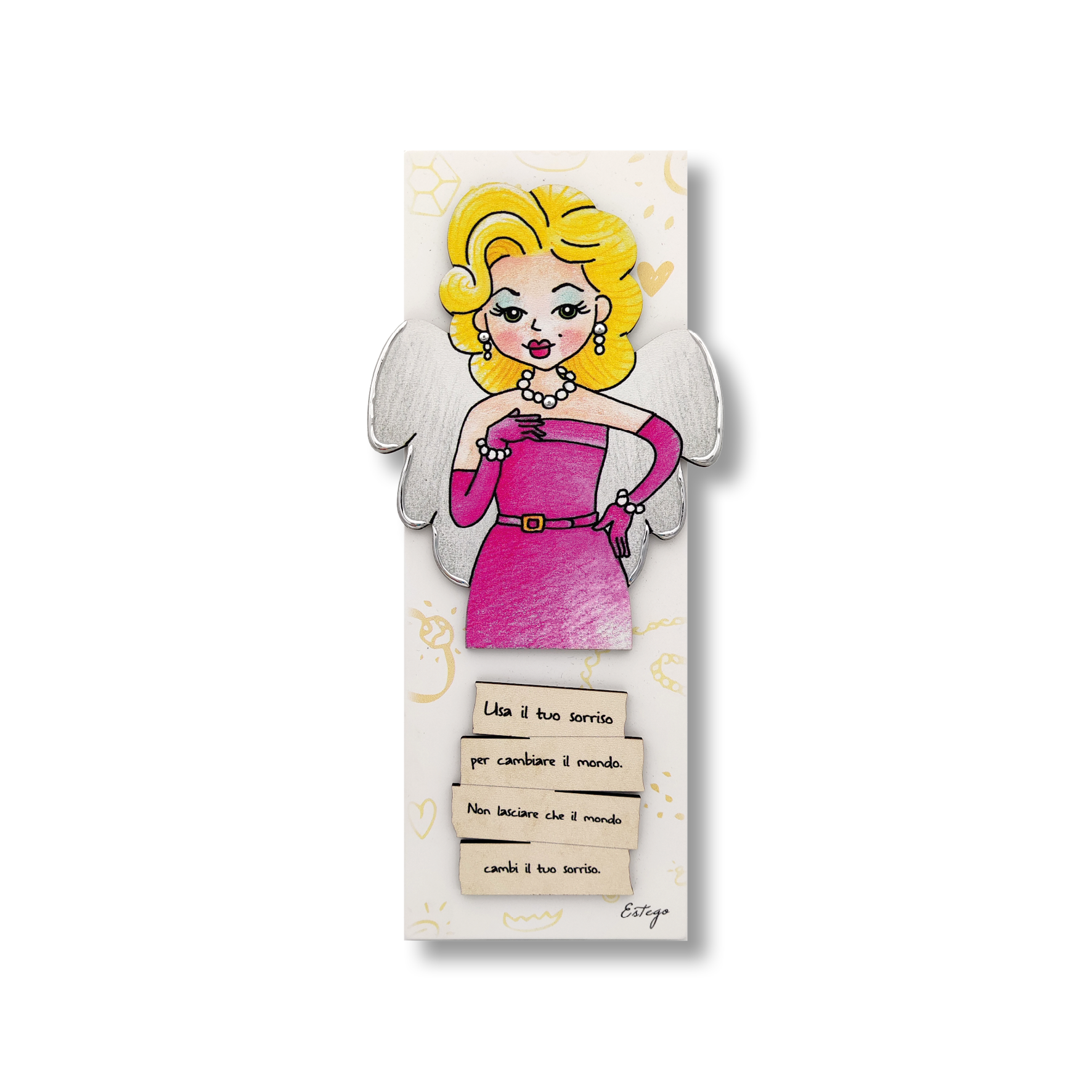 Emozionante, delicato ma soprattutto dolce, il quadretto della collezione Le Graziose di Estego, è il regalo giusto da fare a chiunque si ami. Realizzato in legno e decorato nei minimi dettagli. Dimensioni: 9x25cm. Dotato di doppio montaggio, a muro o da poggio. Ideale anche come idea bomboniera.