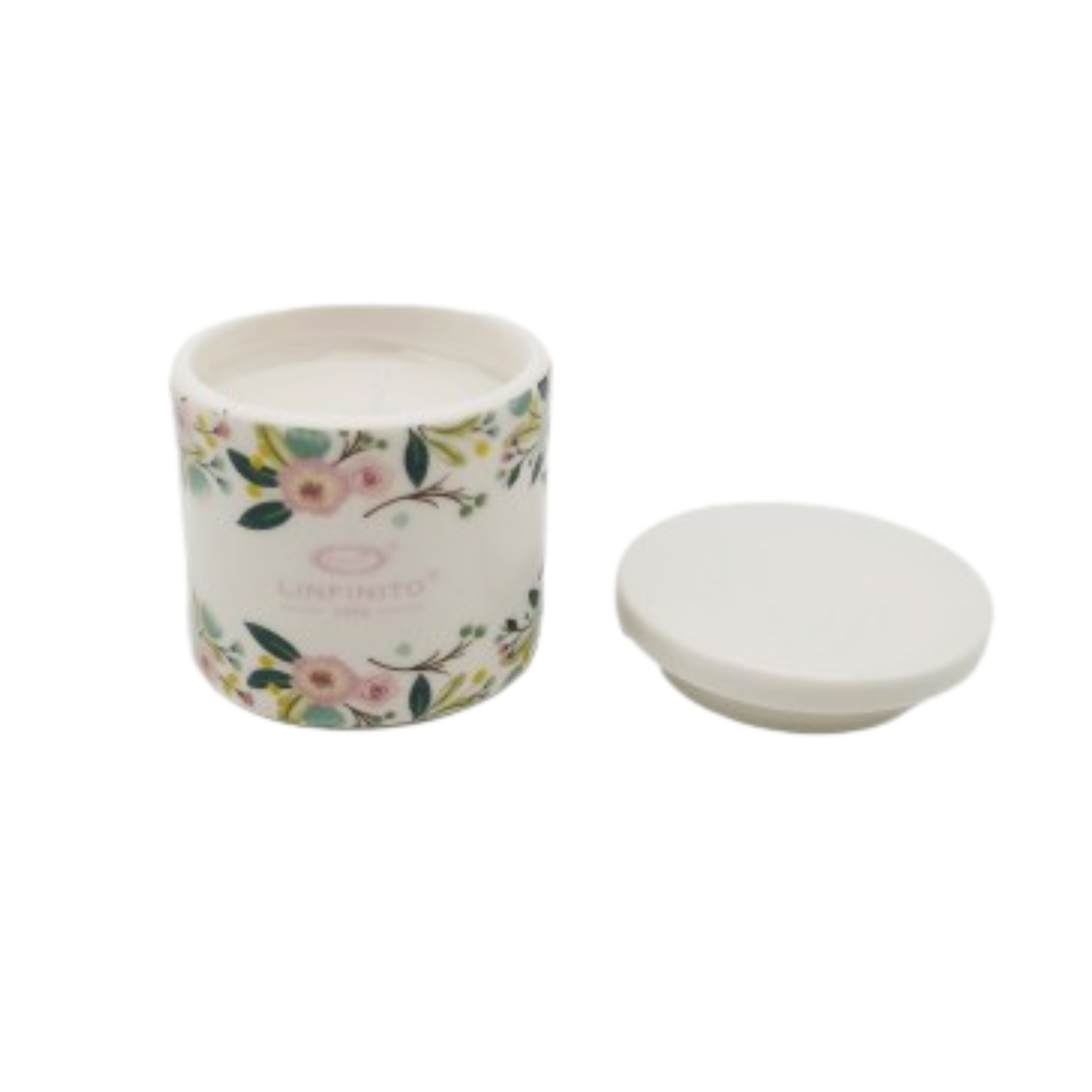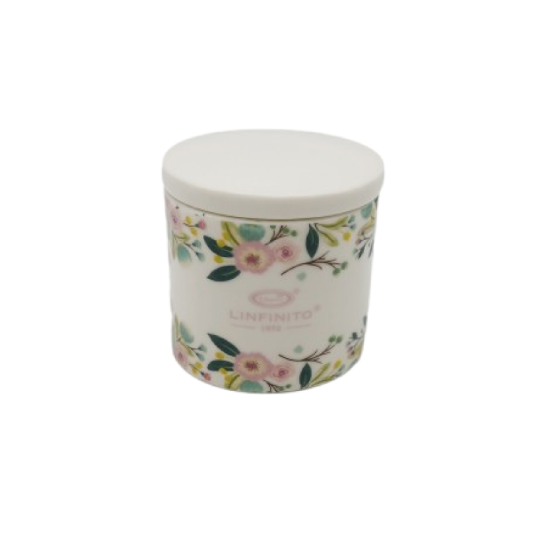 Lasciati incantare dalla candela fiorata L'Infinito Bomboniere in ceramica. Il vasetto con cera naturale all'ambra, in porcellana, con coperchio ti regalerà un delicato profumo di ambra in tutta la casa. Perfetta come regalo o per creare un'atmosfera rilassante e romantica.