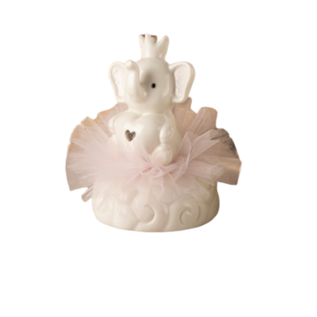 Elefantino rosa su carillon, in porcellana. Altezza: 15cm. Completo di scatola regalo da completare con confezione bomboniera a scelta.