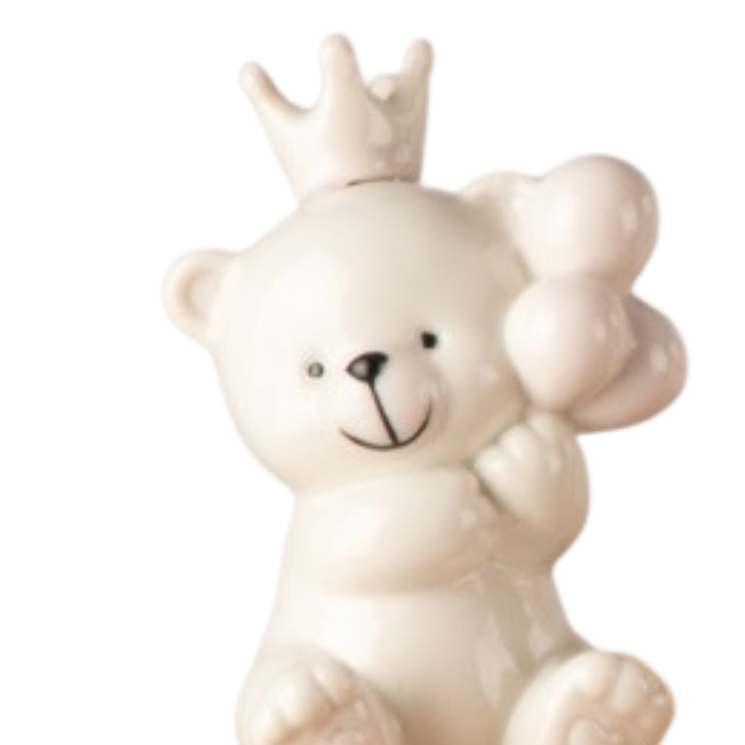 Orsetto rosa piccolo con palloncini, in ceramica. Altezza: 9,5cm. Completo di scatola regalo da completare con confezione bomboniera a scelta.