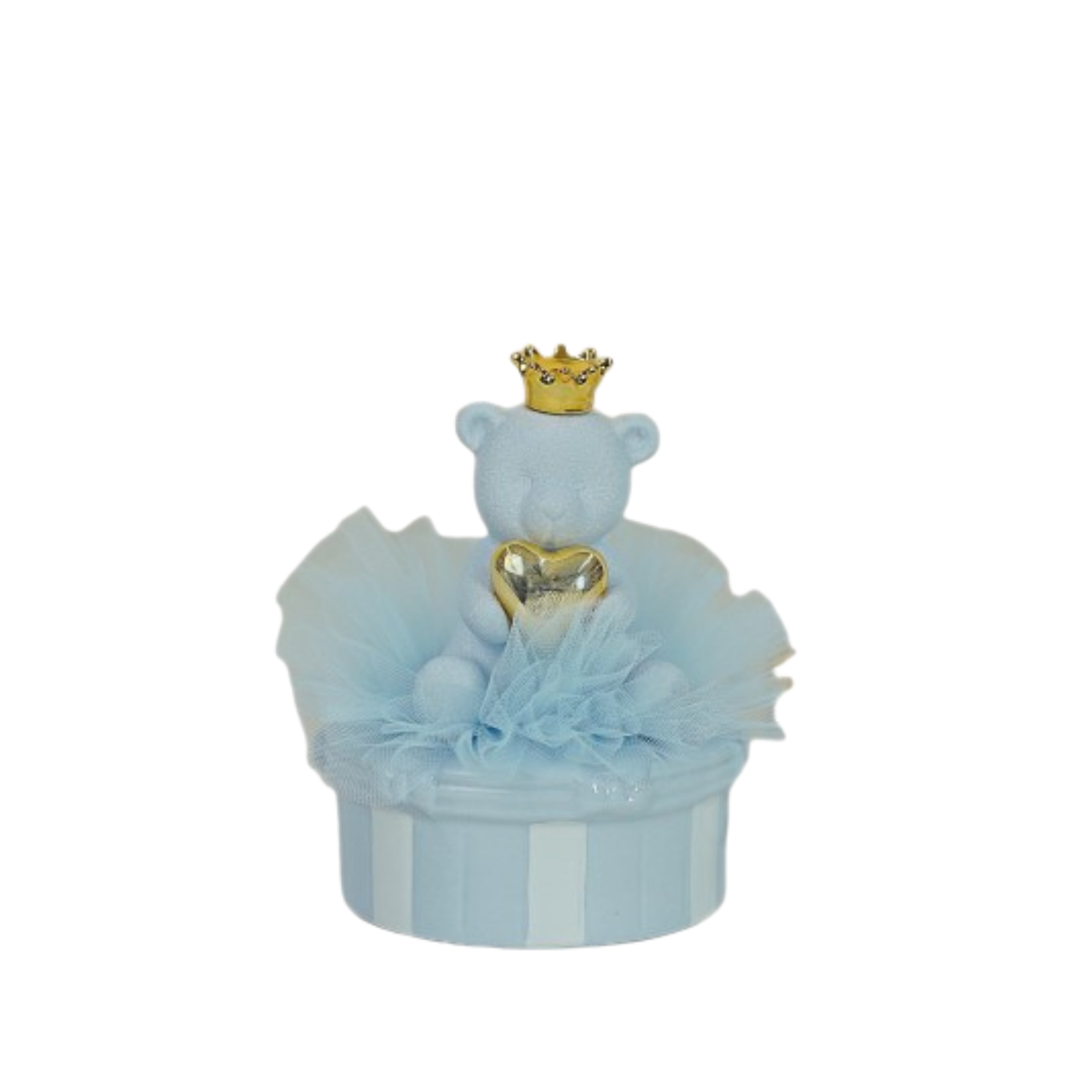 Lasciati incantare dall'Orsetto su Carillon L'Infinito in porcellana, dalle dimensioni di 6x6x8cm. La bomboniera presenta un bellissimo orsetto celeste con corona e cuore dorato, perfetto per un evento speciale come un matrimonio o una nascita. Regala un tocco di dolcezza e grazia ai tuoi ospiti con questo oggetto unico e raffinato.