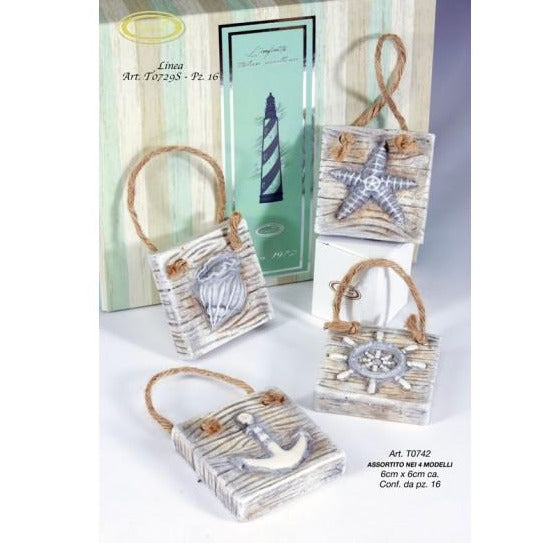 QUADRETTI MARINARESCHI PICCOLI, 4 MODELLI ASSORTITI ( STELLA MARINA, CONCHIGLIA, TIMONE, ANCORA) FINEMENTE DIPINTI A MANO, IN TERRACOTTA, CON CORDONCINO. 6CM X 6CM
