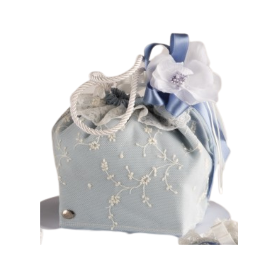 Borsetta grande a base quadra in cotone celeste polvere con pizzo di tulle ricamato Dimensioni: 8x8x14cm oppure12x12x18cm. Ideale per completare una cerimonia ricca di stile ed eleganza. Da completare con confetti a scelta e bigliettino personalizzato