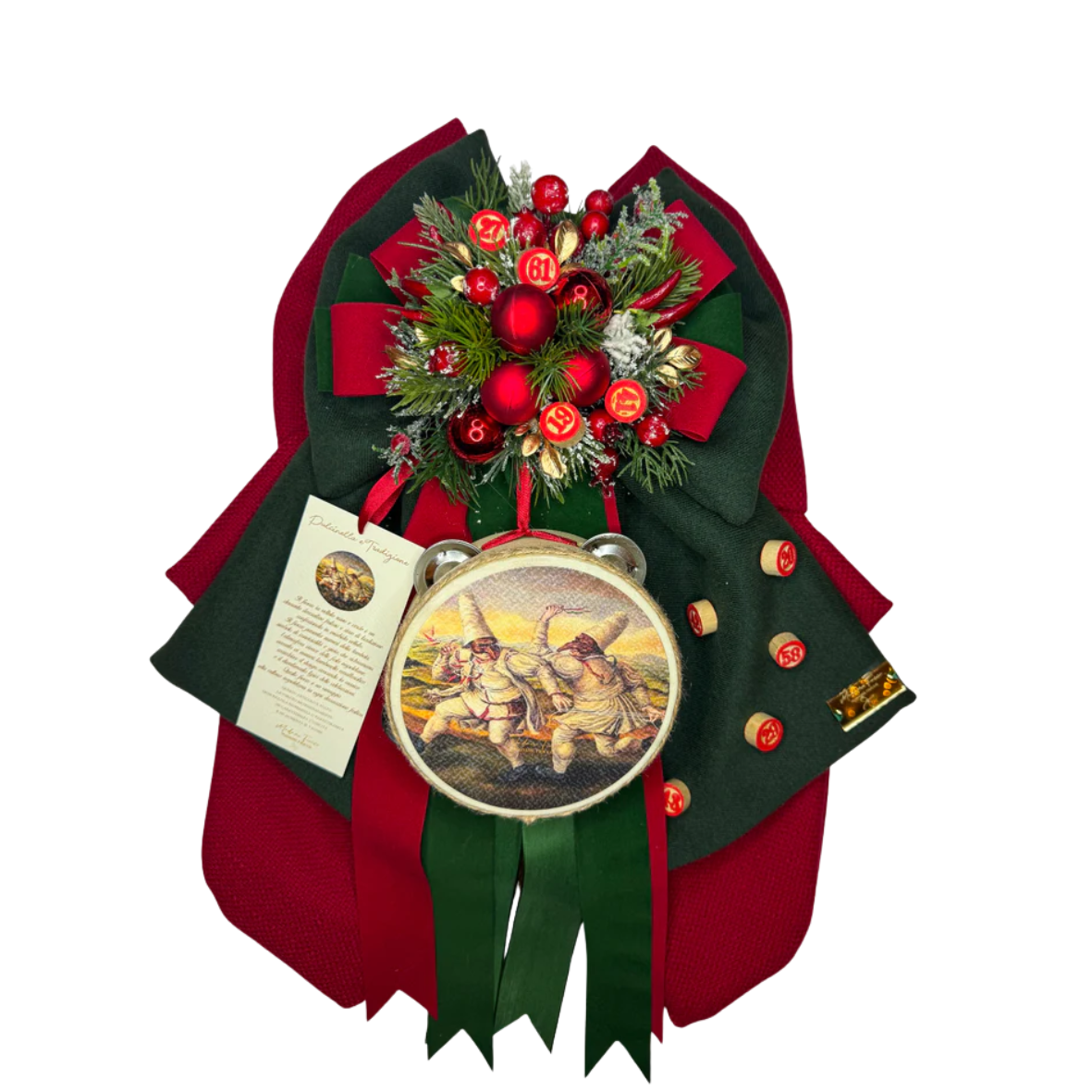 Un fiocco che cattura l'anima del Natale napoletano, dove tradizione e eleganza si incontrano. Realizzato in velluto rosso e verde di pregiata qualità, questo pezzo da 50cm trasforma qualsiasi ambiente in un'atmosfera festiva autentica. Il pendente a tamburello con Pulcinella e i numeri della tombola celebra i simboli più cari delle feste partenopee, portando nella tua casa il calore e la gioia della cultura napoletana. Un accessorio che non è solo decorazione, ma un vero racconto di tradizione e bellezza, perfetto per chi desidera un Natale genuino e ricco di significato.
