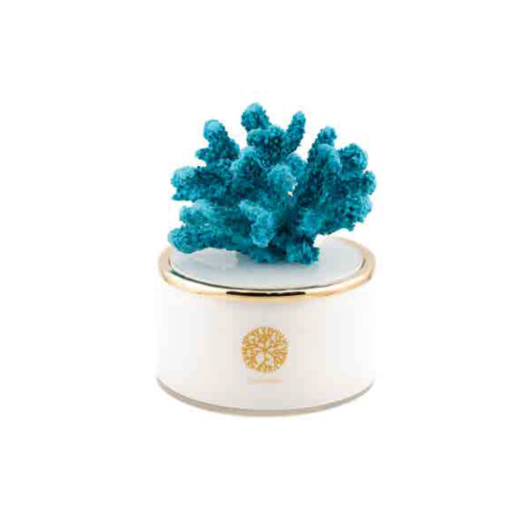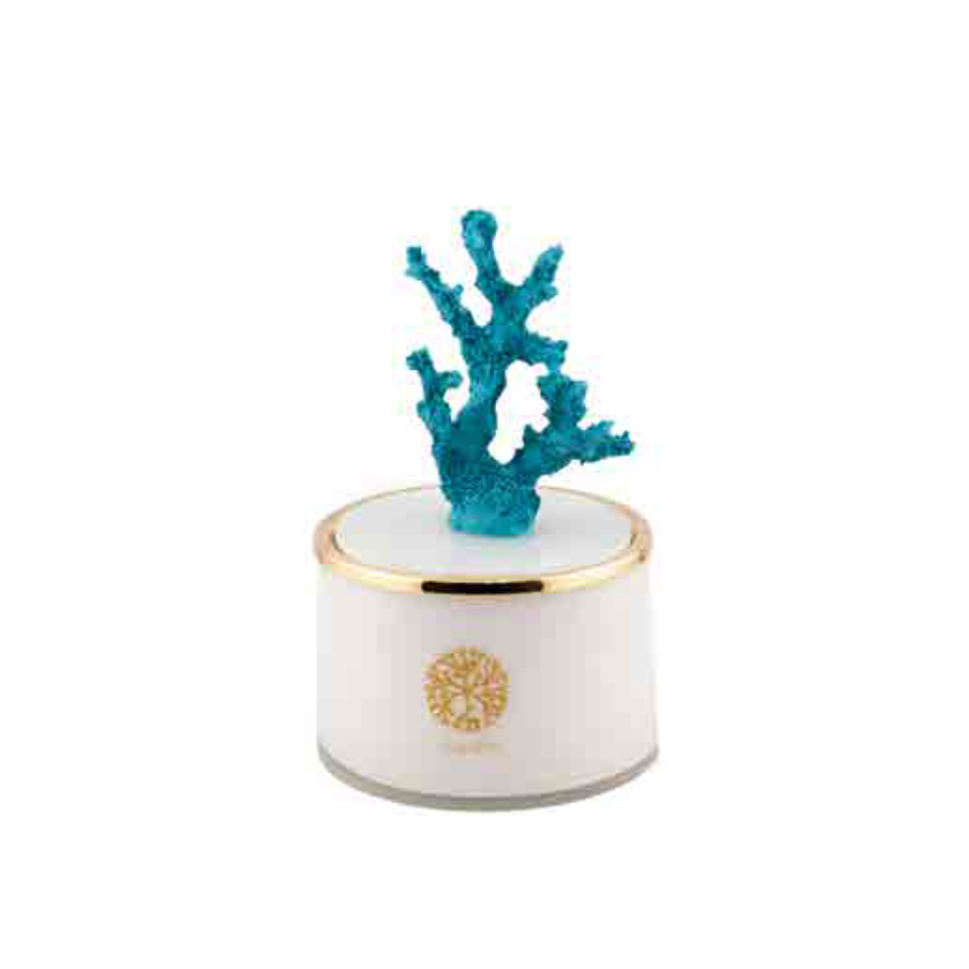 Illumina le tue serate con la CANDELA ELI CON CORALLO CHIARAELA! Questa candela è contenuta in un vasetto di vetro bianco e presenta un dettaglio in resina a forma di corallo color turchese. Ideale per aggiungere un tocco di eleganza e colore alla tua casa.