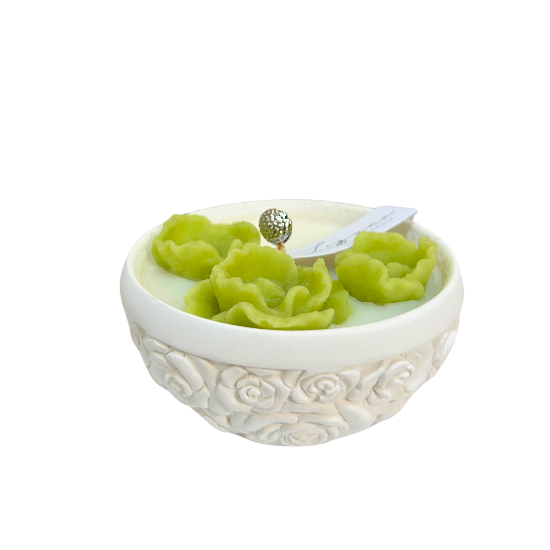 Ispirato dai meravigliosi fiori della Laguna di Venezia, questa candela in ciotola è un'aggiunta perfetta per creare un'atmosfera romantica. Realizzata con cera di qualità e decorata con fiori verdi, la sua luce calda e invitante porterà un tocco di bellezza naturale alla tua casa.