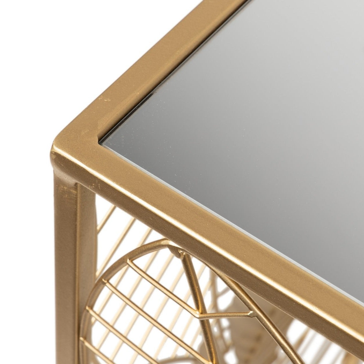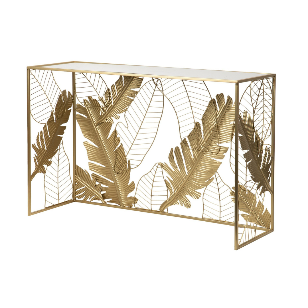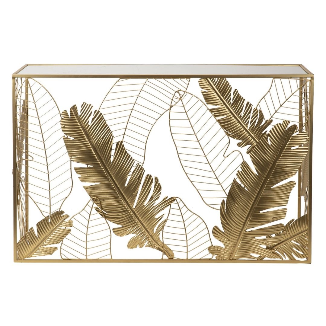 Arreda con stile ambienti moderni e con tanta personalità. La consolle Plant è un complemento d'arredo utile e decorativo da inserire in un ingresso o in un salone di chic. Realizzata in metallo dorato con piano in specchio, completa l'abbinamento con i tavolini della stessa collezione. Dimensioni: 120x40x80cm