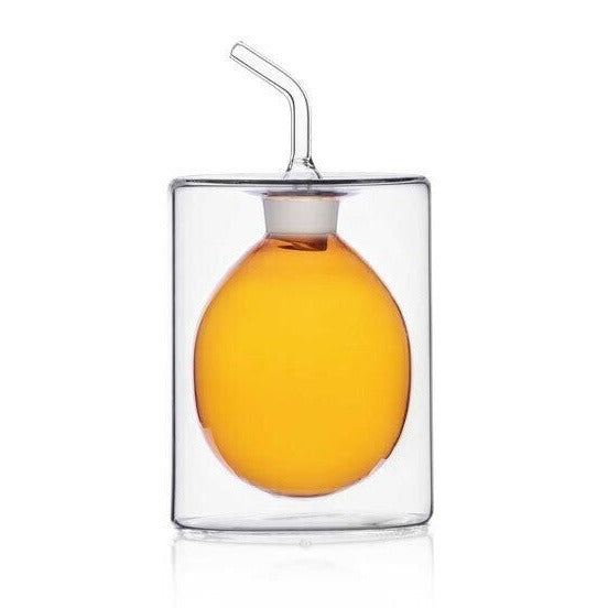 Oliera due pareti collezione cilindro. Le oliere sono in vetro borosilicato lavorate a lume e realizzate a mano. Si consiglia il lavaggio a mano o in lavastoviglie ma a basse temperature. Colori disponibili: ambra e verde. Perfetta come bomboniera per un matrimonio