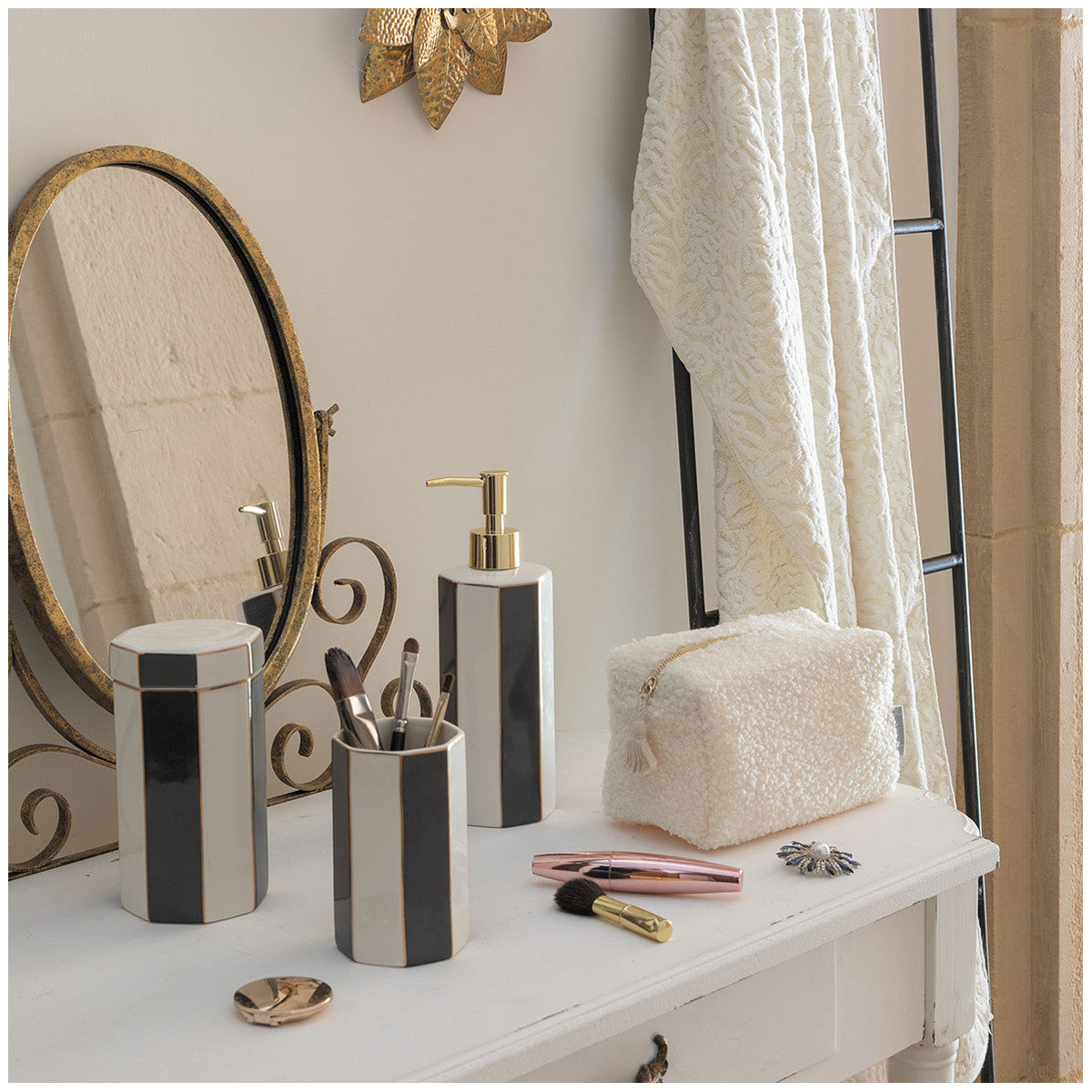 L'iconica linea Madame de Récamier arriva ora in bagno con questo vaso in cotone dalle eleganti linee rosa delimitate da un sottile bordo dorato. Porterà un tocco chic e raffinato alla decorazione dei vostri interni e sarà essenziale per riporre con discrezione i vostri dischetti di cotone o altri piccoli accessori.