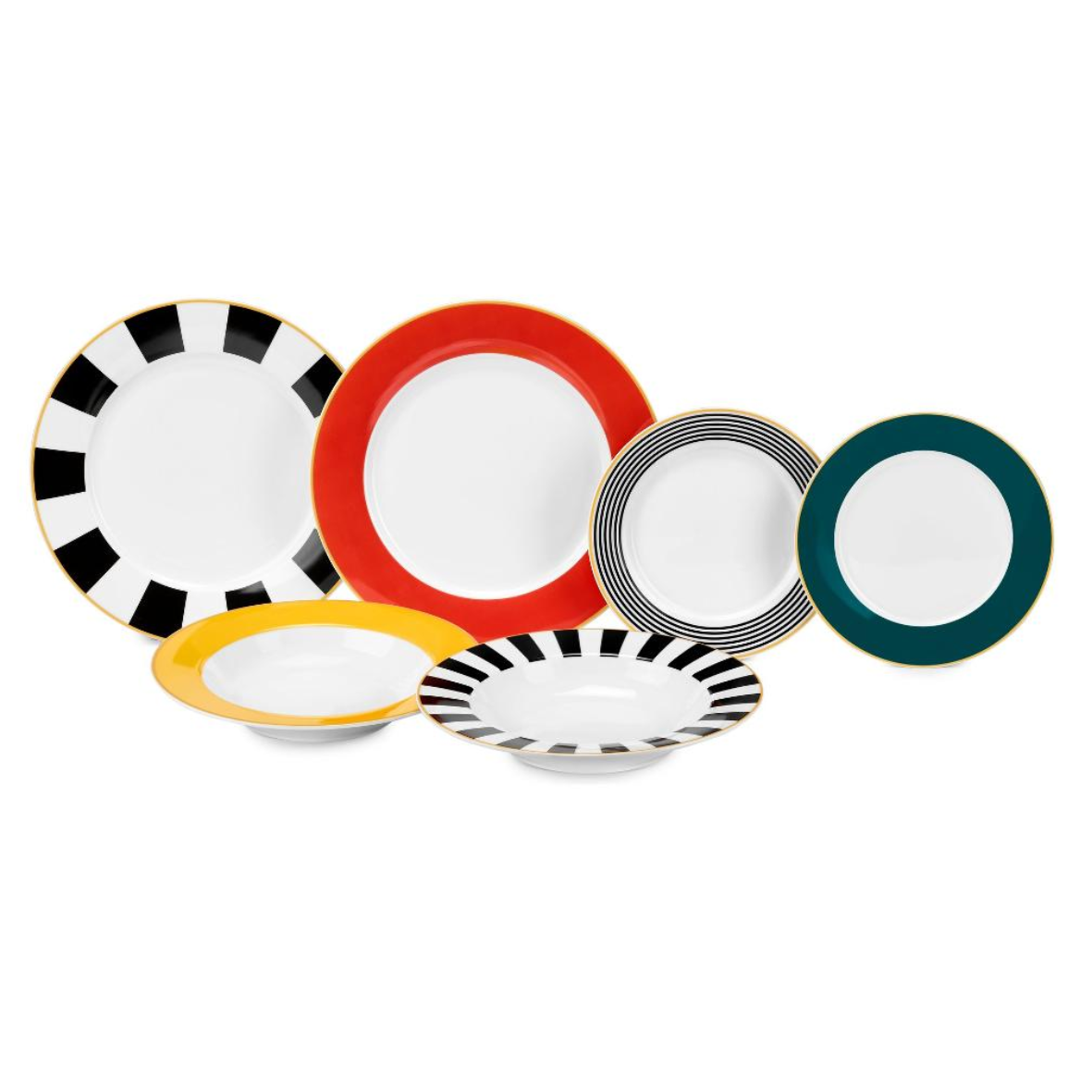 Il servizio piatti Royal Fade Maison in porcellana comprende 18 pezzi: 6 piatti piani da 26 cm, 6 fondi da 23 cm e 6 piatti da frutta da 20,5 cm, perfetto per apparecchiare con stile per 6 persone. Resistente e pratico, è lavabile in lavastoviglie e adatto all’uso in microonde, garantendo comodità e durata nel tempo. Un tocco di eleganza quotidiana per la tua tavola.