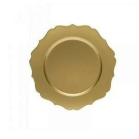 Sottopiatti in plastica finitura oro opaco anticato. Diametro 31cm con bordo sagomato. La finitura anticata presenta delle imperfezioni del colore sul piatto.