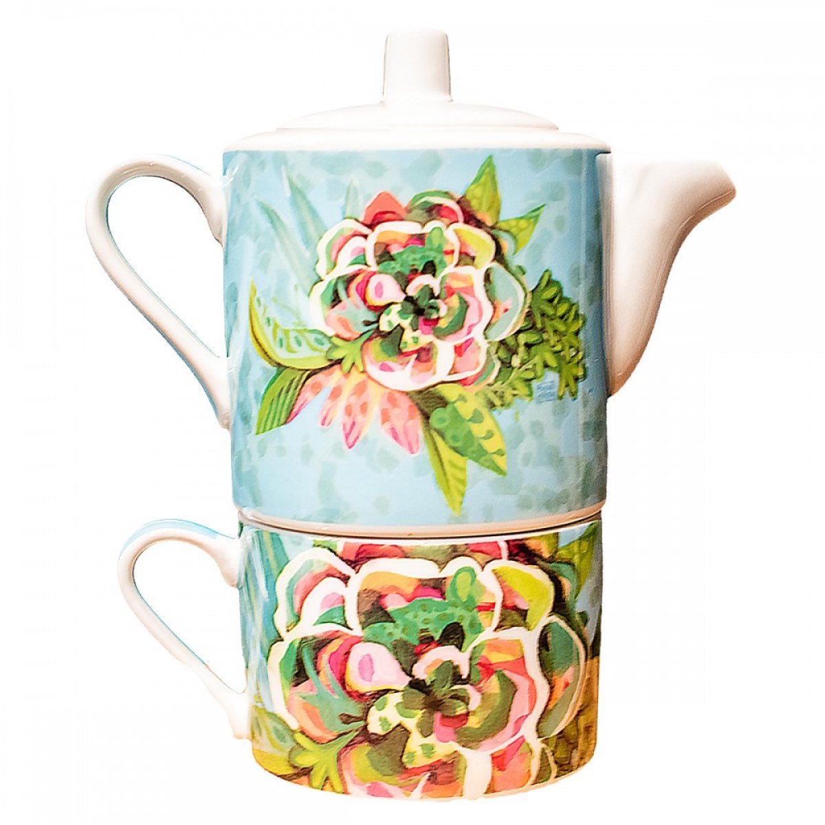 Piccola teiera in ceramica con tazza abbinata per 1 persona. Perfetto per bere il tuo tè da solo e rendere questo momento di relax il tuo piccolo momento. Design originale e colorato dell'artista Michelle Allen per la collezione Allen Designs.