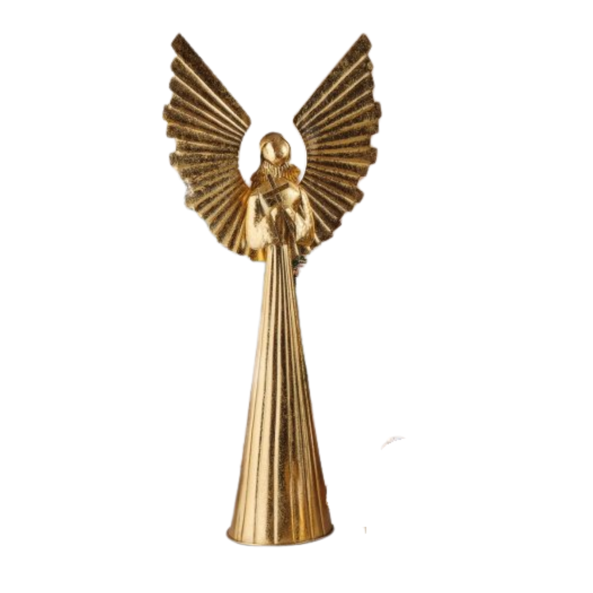 Questo magnifico angelo in latta dorata incarna eleganza e spiritualità, trasformando qualsiasi ambiente in uno spazio di serenità. Con il suo design raffinato e le generose dimensioni di 29 x 12 x 65,5 cm, diventa un elemento decorativo straordinario che cattura lo sguardo. Ideale per ingressi, salotti o angoli speciali della casa, infonde protezione e benevolenza durante le festività natalizie e oltre. Un'opera che combina artigianalità e significato simbolico, perfetta per chi desidera aggiungere calore spirituale e sofisticatezza al proprio ambiente.