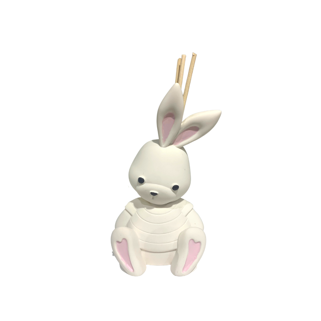 Coniglietto in resina di colore bianco con dettagli rosa, che funge da profumatore; oggetto dolce e simpatico, ideale come bomboniera per festeggiare un'evento dedicato al proprio bambino. Contenuto in scatola regalo e dotato di bastoncini in legno e profumo. Altezza 9cm
