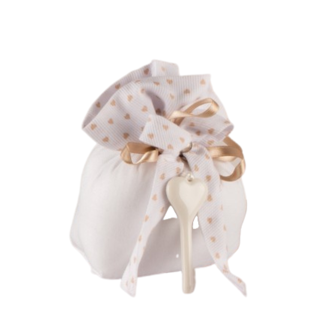 Sacchetto tondo grande con chiave in porcellana. Dimensioni: Ø10x13cm. Ideale per completare una cerimonia ricca di stile ed eleganza. Da completare con confetti a scelta e bigliettino personalizzato