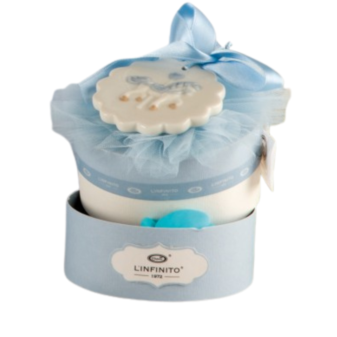 Scatola con base portaconfetti, con medaglione con cavalluccio celeste. Dimensioni: Ø10x8cm. Completo di scatola confettata con 20 confetti circa, da completare solo con bigliettino personalizzato