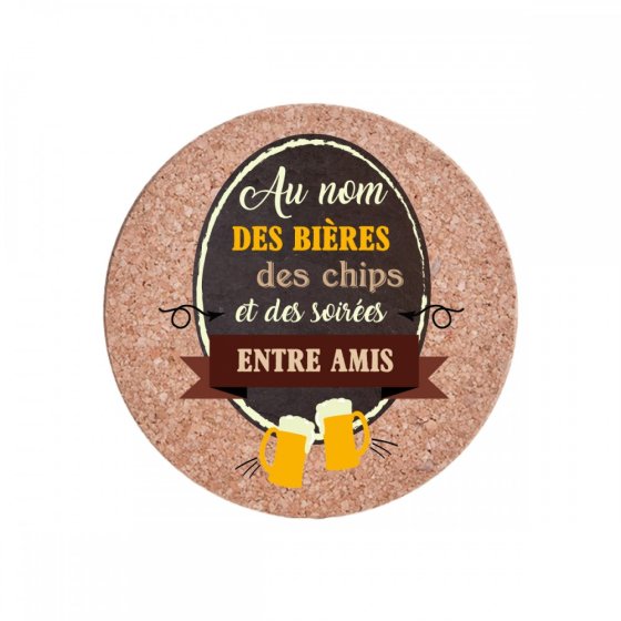 Sottopentola in sughero magnetico con la citazione "In nome di birre, patatine e serate con gli amici". Non c'è bisogno di spostare pentole o padelle e sottopentola separatamente perché questo è magnetico e si attacca sotto gli utensili. Un pratico, utile , regalo decorativo e originale